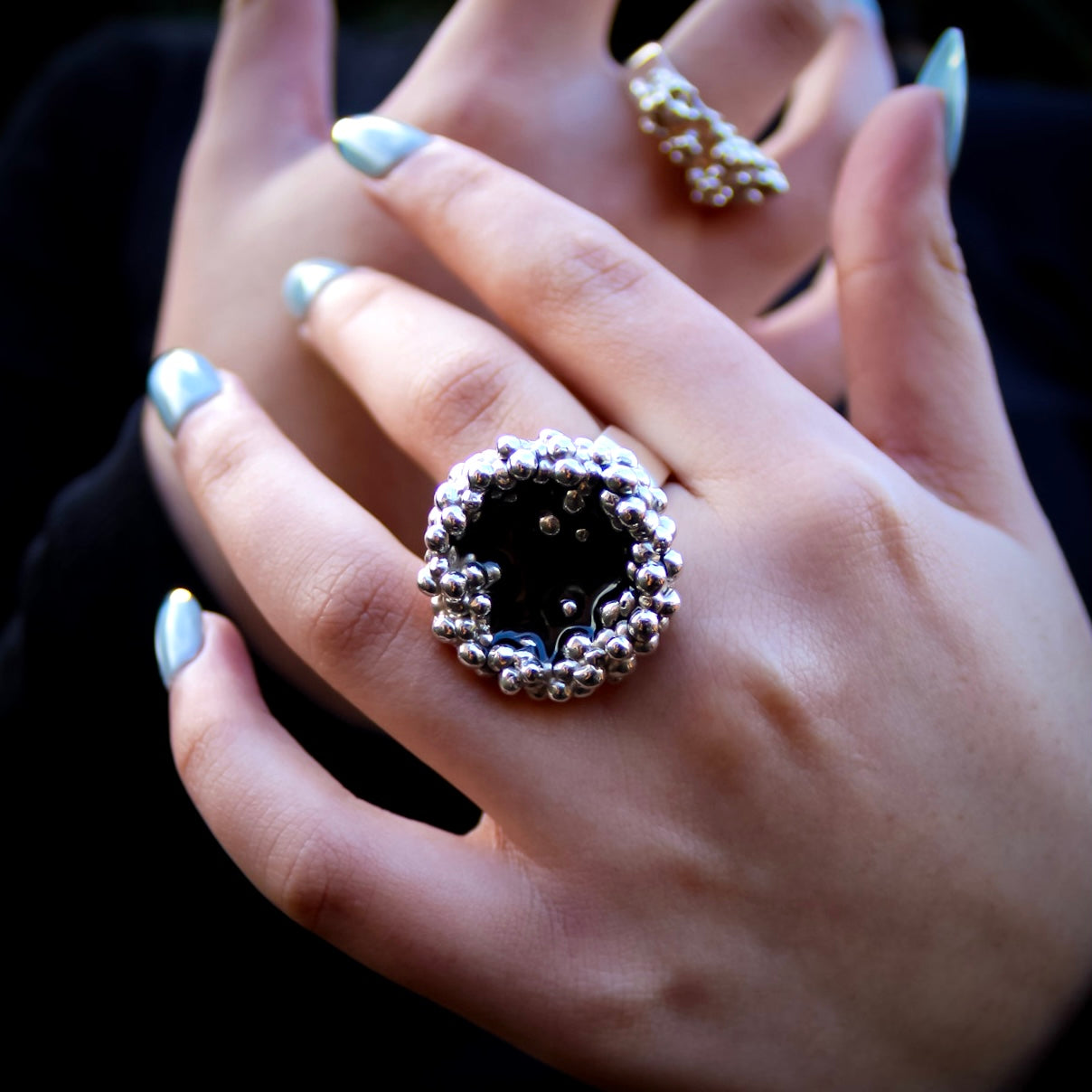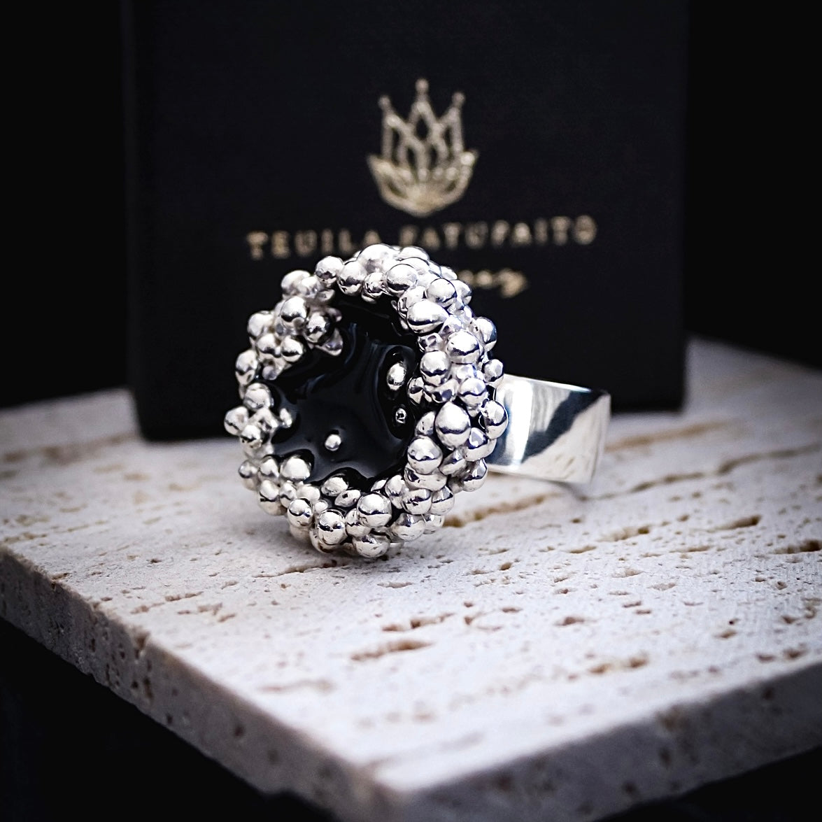 The newest wave in the Plerogyra Ring Series. Teuila Fatupaito's Midnight Tide Ring is expertly handcrafted from solid 925 sterling silver and accented with rich black resin. Inspired by the intricate forms of natural coral reefs, this ring captures the fluidity and depth of ocean life. Its detailed craftsmanship and organic design make it a distinctive piece that embodies the harmonious beauty of nature and the sea.